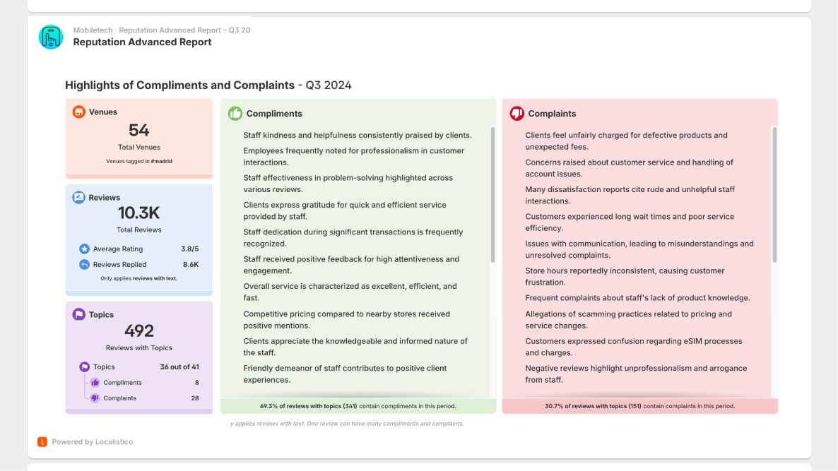 Turn complex performance data into clear summaries using AI. Track reviews and store activity across hundreds of locations with automated insights that show you exactly what's working and what needs attention. Get quick answers about market trends and individual store performance through instant analysis.