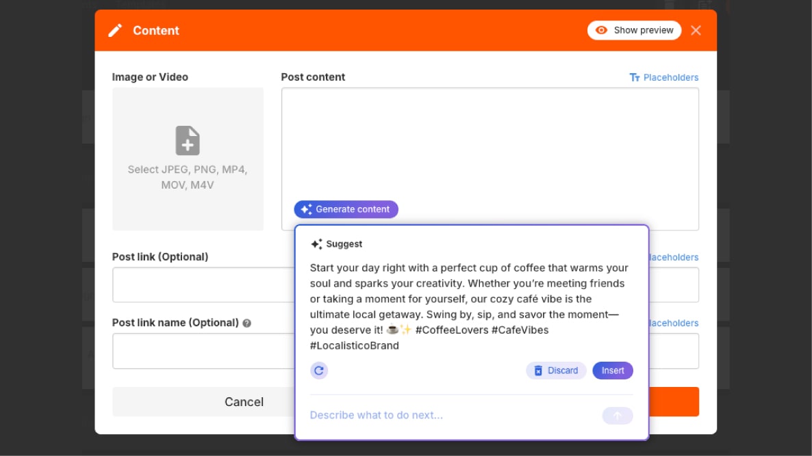 Localistico's AI works as a practical tool that supports your team's decisions and streamlines local marketing workflows. Scale your local impact across thousands of locations without adding operational complexity. Get clearer insights and faster operations to help your brand perform better in every local market.