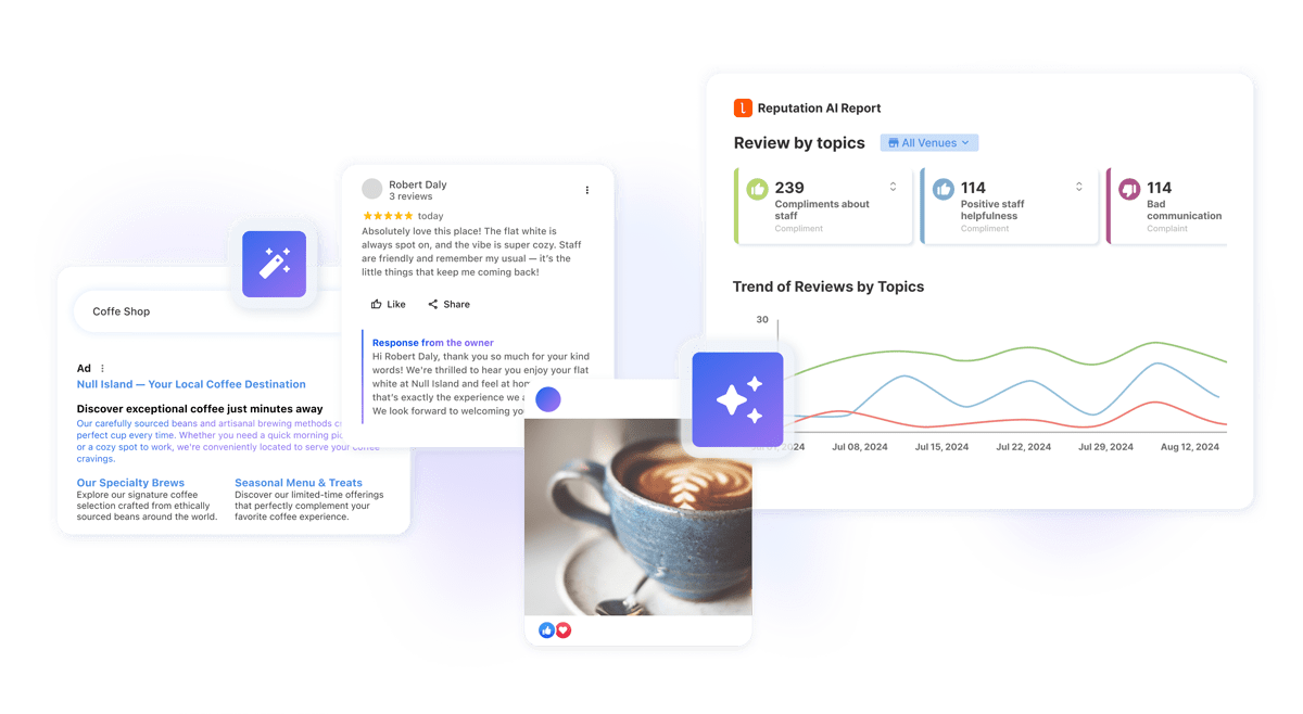 Your stores deserve to be found, and we make sure the content that gets them there is always fresh, relevant and local. Generate SEO and SEM content tailored to each market using AI that understands your brand. Create headlines, descriptions, landing pages, and location-specific content that performs in search. Plus, our AI helps your team respond to customer reviews with suggested responses that stay on-brand and sound natural.
