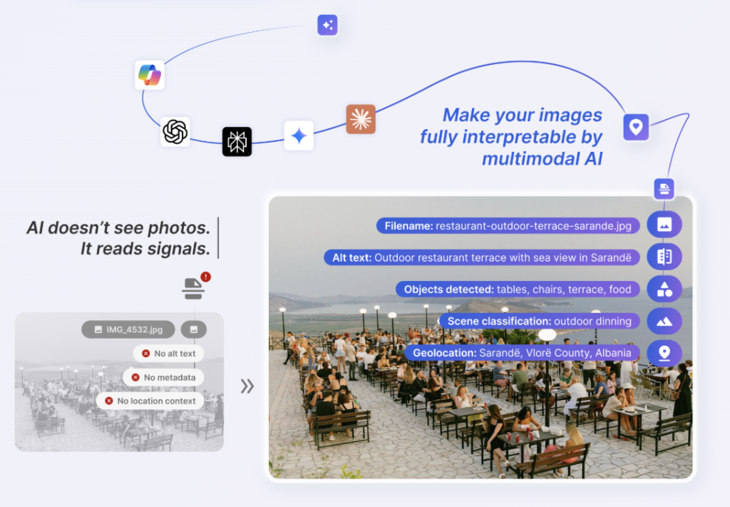 AI Visual Asset Editor — AI doesn’t see photos: it reads signals. With the AI Visual Asset Editor, teams get full control over how their images are interpreted by AI-powered search and discovery systems. The platform automatically enriches every image with optimised file names, alt text, object detection, scene classification, and geolocation — applied individually or across libraries of thousands of images — ensuring consistent visual signals that are ready for the multimodal AI era.